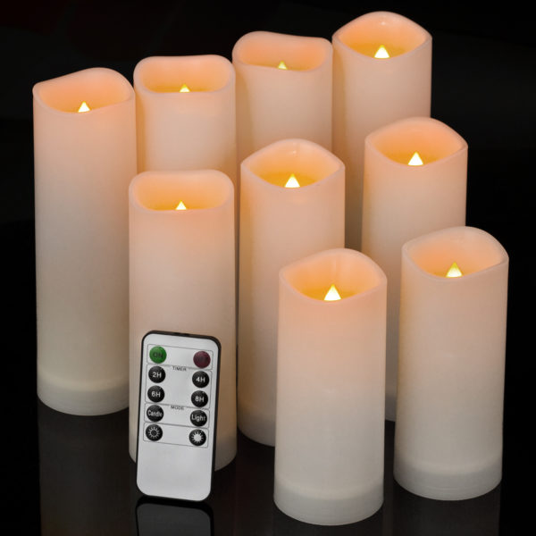 ENERGY SAVING, POWERFUL LEDS: This value pack comes with 9 Outdoor Flameless Candles(D2.15 * 5″5″6″6″6″7″7″7″7″), 1 Remote Control and a User Manual. Powered by 2 x AA batteries (not included) per outdoor battery candles. The expected battery life is of approx 200 hours (high-grade battery required) while the lifetime of the led lamps is up to 50,000 hours!